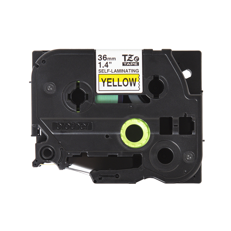 BROTHER Cinta Autolaminada Texto negro sobre fondo amarillo.